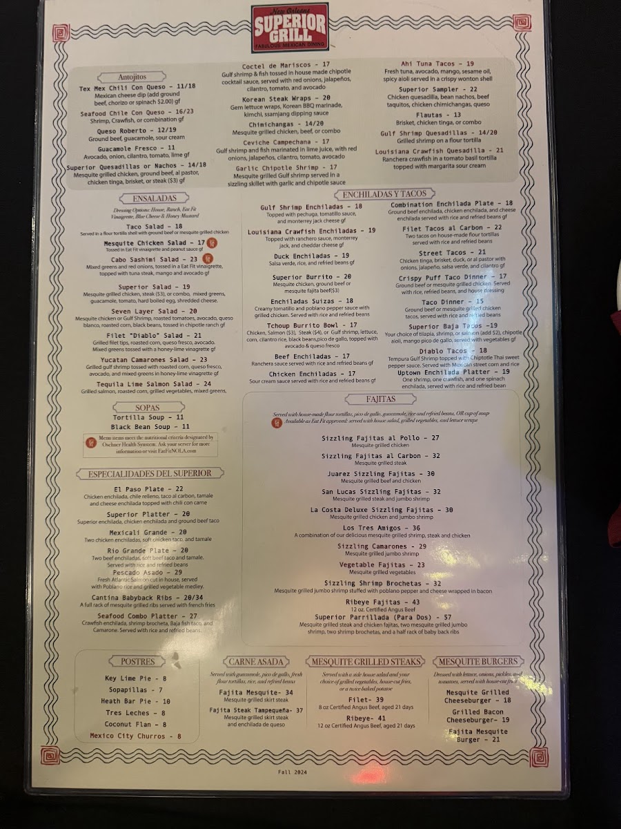 Welcome to Superior Grill, located at 3636 St Charles Ave, New Orleans, LA. This culinary gem offers an enticing lunch and dinner menu featuring vibrant flavors of Mexican cuisine. Immerse yourself in the delightful options, such as Gulf Shrimp Enchiladas, paired with creamy tomatillo sauce for just $20.99, or savor the Crispy Puff Taco Dinner with mesquite-grilled chicken at $19.99.